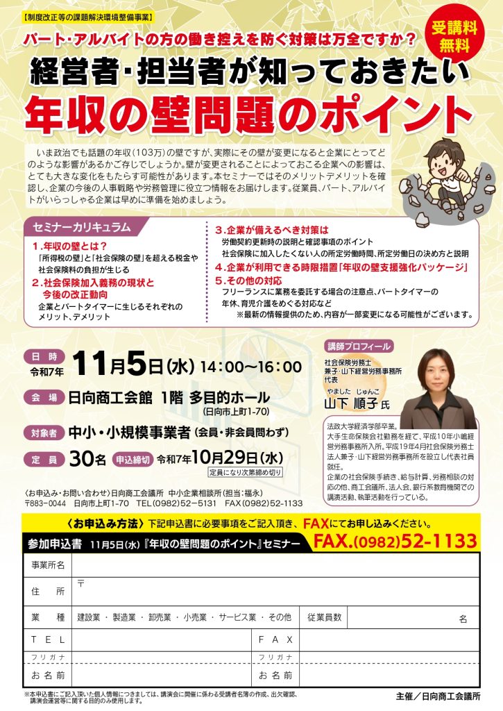 いま政治でも話題の年収(103万)の壁ですが、実際にその壁が変更になると企業にとってどのような影響があるかご存知でしょうか。壁が変更されることによっておこる企業への影響は、とても大きな変化をもたらす可能性があります。本セミナーではそのメリットデメリットを確認し、企業の今後の人事戦略や労務管理に役立つ情報をお届けします。
